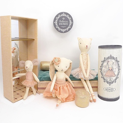 Maileg Dancing Ballerina Bunny é uma boneca de algodão suave com forro fofo nas orelhas e usa um tutu rosa pálido, pedaços de flores e sapatos de ballet.