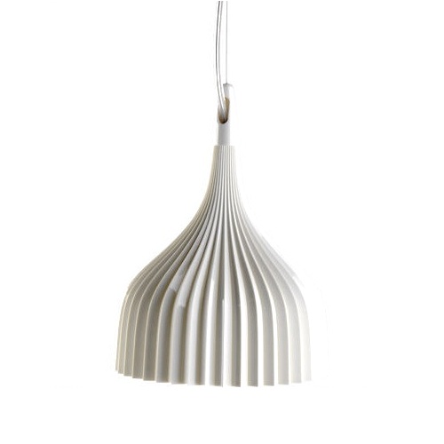 O "É" de suspenção é um candeeiro de design simples e essencial composto por um difusor em forma de rosácea de policarbonato plissado e fixo ao tecto por um suporte cromado.