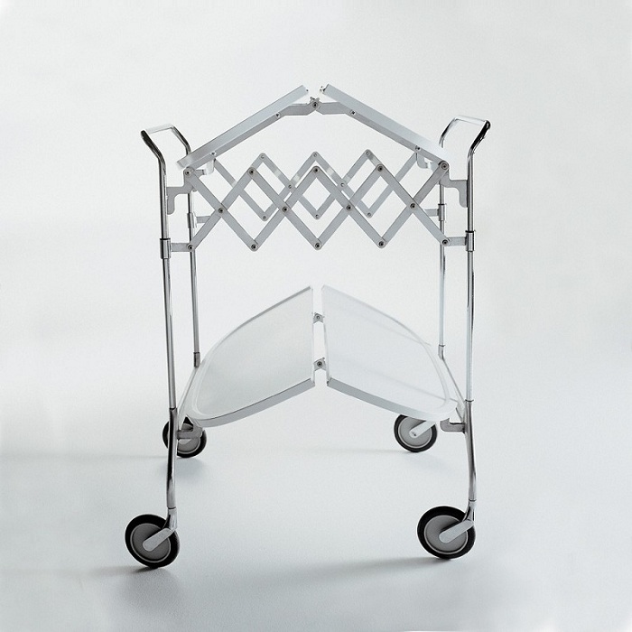 O Gastone é um prático e elegante carrinho dobrável, com tampo em material plástico reforçado com fibra de vidro, pintura anti risco e estrutura em aço cromado.