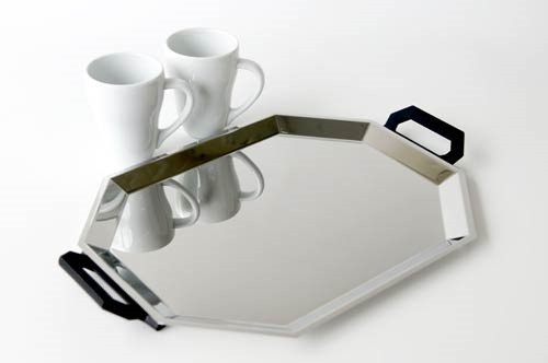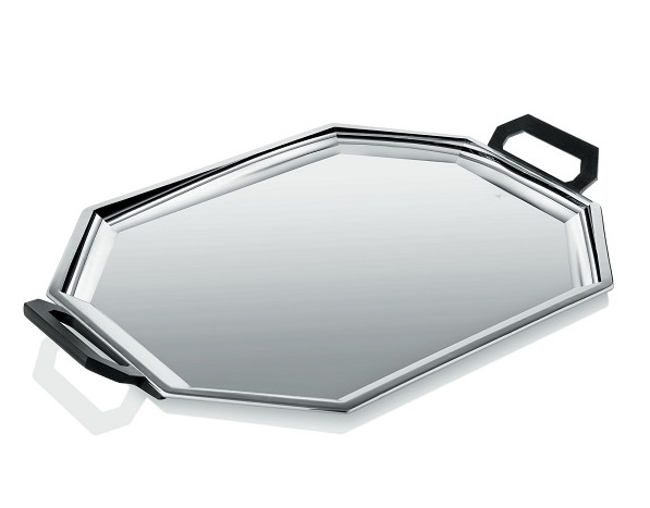 Tabuleiro em aço inoxidável polido, e pegas em baquelite.